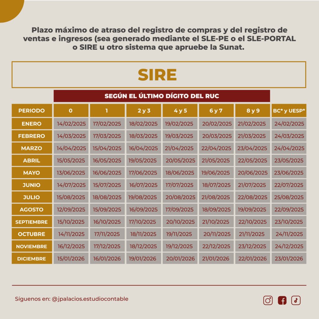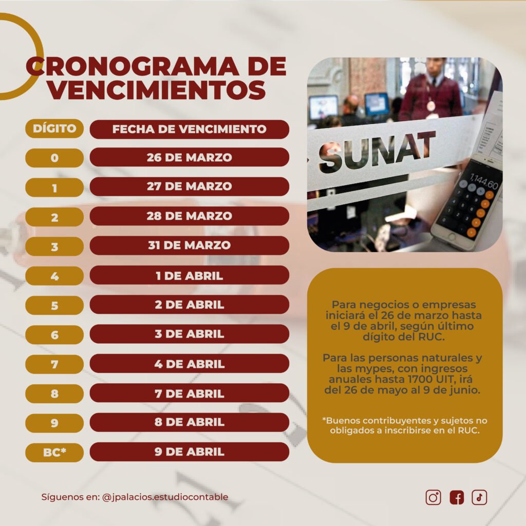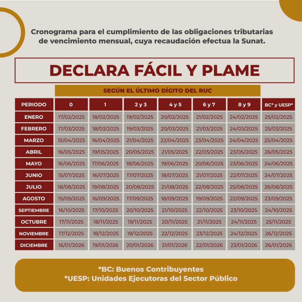 Verifica la fecha máxima de vencimiento para la declaración y pago de tus obligaciones mensuales de acuerdo al último dígito de tu RUC.